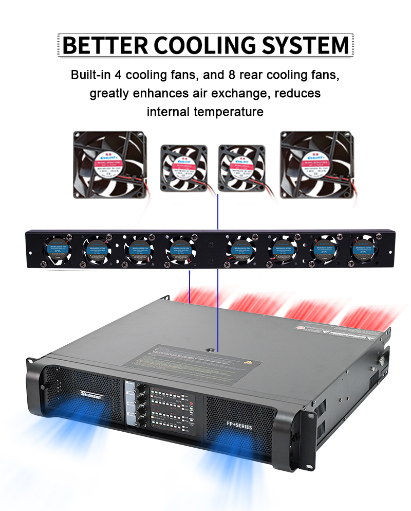 | Characteristic | ►4 Channel Class TD Switching power amplifier ►4 x 4,400 Watts into 4 Ohms, 4 x 2,500 Watts into 8 Ohms ►Create SUPER sound quality, good for dual 18”/21” subwoofer ►Separately controllable on Gain ►Scalable Voltage Peak Limiter (VPL) ►The bridge-mode operation for Touring Applications ►Comprehensive protection scheme ►Use Original ONSEMI power output transistor ►Neutrik XLR*/Speakon connectors ►New heat sink Upgrade cooling system, added 8 fans on the rear panel. Enhance the heat dissipation capability of the amplifier. ►Upgrade high-quality capacitors 3600uf/200V The old one is 3300UF 200V and now the new is 3600UF 200V. Totally add more 300UF capacity. |