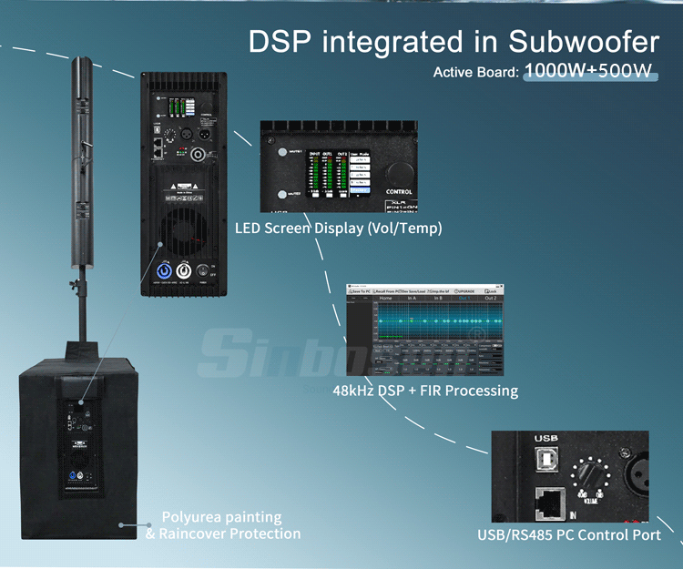 Bulit in DM10.5 Muti-functional dsp module: LED Screen Display (Vol/Temp), 48kHz DSP + FIR Processing, USB/RS485 PC Control Port,Comprehensive protection