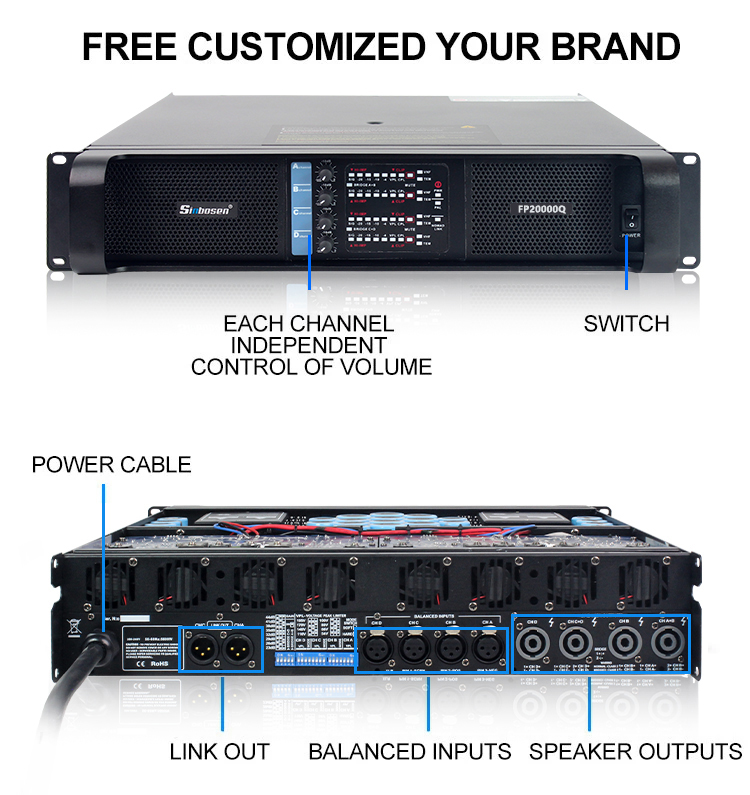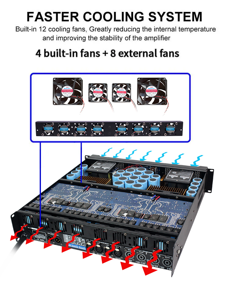 4 x 4,000 Watts into 4 Ohms,4 x 2,200 Watts into 8 Ohms. Creat SUPER sound quality,good for dual 18 inch subwoofer. Extended heatsink board to 94 mm. Separately controllable on Gain. Scalable Voltage Peak Limiter (VPL). Bridge-mode operation for Touring Applications. Comprehensive protection scheme. New cooling system: 8 small fans are added to the rear panel to quickly dissipate heat. Work is more stable. Neutrik XLR*/speakon connectors. Upgrade Import Siemens capacitor 3600uf 200V, Add 4 2200UF capacitors (8800UF). Use Original ONSEMI transistor. High quality fans from TaiWan. Multi-color panel. |